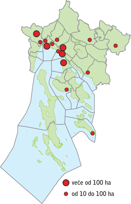 U dokumentima prostornog uređenja utvrđeno je ukupno 41 proizvodna zona i 168 poslovnih zona. Od toga 5 zona državnog značaja (većih od 100 ha), 43 zone srednje veličine regionalnog značaja (od 10 do 100 ha) te 161 mala zona lokalnog značaja (do maksimalno 10 ha).